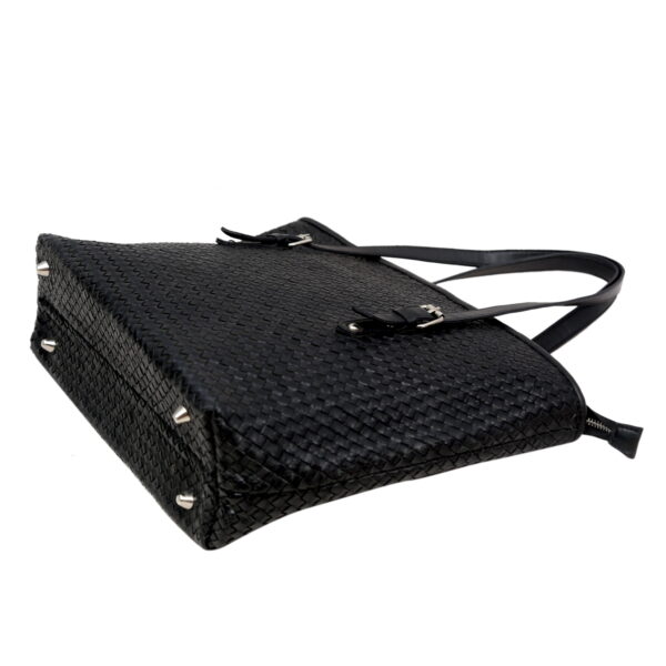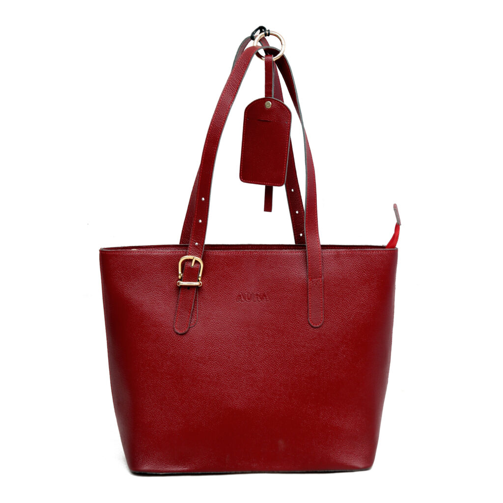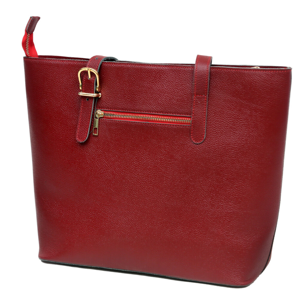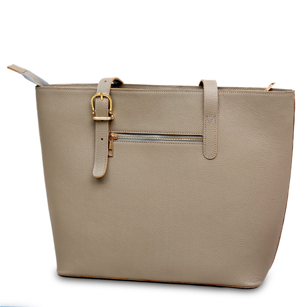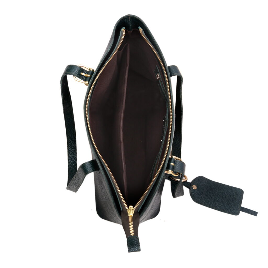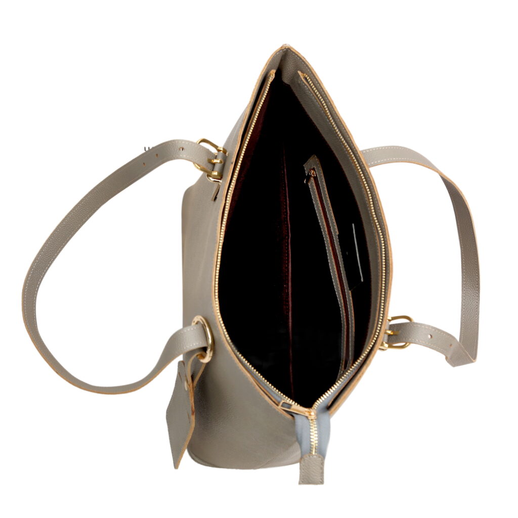 The structured silhouette features adjustable shoulder straps, metal base studs for protection, and a secure top-zip closure to keep your belongings safe. Inside, the tote offers generous space with organized compartments for your essentials — from your laptop to your wallet.